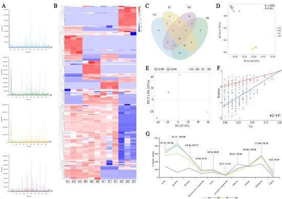 Analysis of total volatile compounds in different grades of Wuyi Shuixian tea (n = 3 per grade). (A) The total ions chromatogram, (B) Heat map of the volatile compounds, (C) VOCs Venn diagram; (D) Score scatter plot for PCA model (total); (E) PCA analysis of different grades of samples; (F) VOCs concentration line chart; (G) Content analysis of the ten types of volatile compounds. SA: Special prize; SB: first prize, SC: Excellent prize; SD: unnominated.