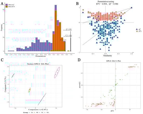 OPLS-DA analysis illustrating the differences in grades of Wuyi Shuixian tea (n = 3 per grade). (A) Test plot of OPLS-DA model for volatile components at different grades of Wuyi Shuixian tea; (B) The OPLS-DA model cross-validation results; (C) Scores OPLS-DA plot for analysis of within- and between-group differences in the different grades of Wuyi Shuixian tea; (D) OPLS-DA S-Plot screening of key volatile components differentiating various grades of Wuyi Shuixian tea.