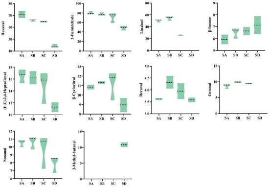 Zhu et al. [31] found that the main aroma components of Wuyi Shuixian tea are Hexanal, Linalool, β-Ionone, and Nerolidol. This study found that Furaldehyde (31.7%), Hexanal (28.1%), and Linalool (14.8%) accounted for a significant proportion of the total content of these 10 substances (Table S8), with Furaldehyde and Hexanal decreasing as the grade decreased, while Linalool, which has a floral aroma, first increased and then decreased, reaching its maximum value in SB. Notably, the content of β-Ionone, which imparts a violet aroma, showed a negative correlation with grade, indicated by SA < SB < SC < SD, and there was a highly significant difference between SA and SD (p < 0.05). Additionally, the trace apple-scented compound 3-Methyl-butanal was detected only in SD, with a content of 10.8 μg/kg, accounting for 7.6% of the total key compounds in SD.