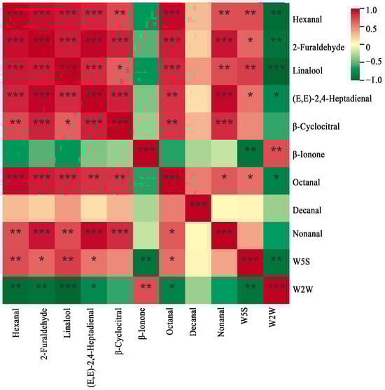 Correlation analysis showed (Figure 5) that the W5S sensor of the electronic nose was significantly positively correlated with Hexanal, 2-Furaldehyde, Linalool, (E,E)-2,4-Heptadienal, and Octanal, and significantly negatively correlated with β-Ionone. The W2W sensor of the electronic nose was significantly and negatively correlated with Hexanal, 2-Furaldehyde, Linalool, (E,E)-2,4-Heptadienal, and Octanal, and significantly positively correlated with β-Ionone. Further elucidated that Octanal and linalool were the aromatic compounds present in high-quality Wuyi Shuixian tea.
