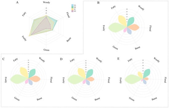 Further analysis of the aroma composition characteristics of different grades of Wuyi Shuixian tea revealed that the OAVt (111.7) of SA consists of 32.2 fruity, 22.4 fatty, 19.9 floral, 18.4 woody, 11.7 burnt, and 7.1 green components, indicating that fruity is the predominant component in SA, with fatty, floral, and woody components evenly distributed, supplemented by burnt and green, ultimately forming the aroma type of SA (Figure 6B). The OAVt (120.8) of SB consists of 35.2 fruity, 24.6 fatty, 21.6 floral, 20.2 woody, 11.3 burnt, and 7.9 green components, similar to the overall composition of SA (Figure 6C). The OAVt of SC is 111.2, consisting of 35.6 fruity, 23.4 fatty, 20.4 woody, 13.9 floral, 10.4 burnt, and 7.4 green components, with fruity being the main aromatic substance, fatty and floral components evenly distributed, and finally supplemented by burnt and green (Figure 6D). The OAVt (72.8) of SD consists of 30.0 fruity, 17.3 woody, 11 fatty, 7.2 burnt, 6.2 floral, and 1.1 green components, indicating that although SD is also predominantly fruity, it has woody and fatty as secondary aromas, followed by floral, burnt, and green (Figure 6E).