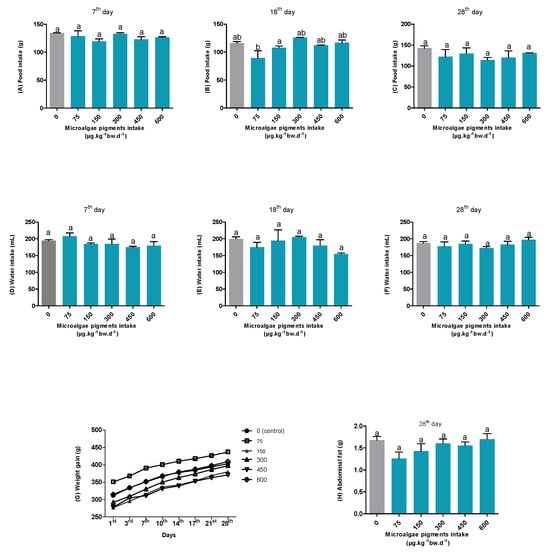 Data on the food and water intake, body weight, and abdominal fat were collected to analyze the rats’ eutrophy status in the experimental period. As shown in Figure 1, the food intake (A, B, and C) among the groups that received different concentrations of microalgal pigments (0, 75, 150, 300, 450, and 600 µg·kg−1bw·d−1) did not differ throughout the experiment, except for the 75 µg·kg−1·bw·d−1 group on the 18th day. However, by day 28, this difference was no longer observed. Likewise, no statistical differences were found between the groups for water intake (Figure 1D–F). Furthermore, Figure 1G shows that the body weight gain in the experimental groups followed the same variation pattern as the control group (0 µg·kg−1bw·d−1) throughout the experiment (from day 1 to day 28).