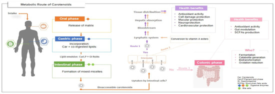 From this point, three potential routes may be followed: Route 1—carotenoids are absorbed and transported via chylomicrons into the lymphatic system, then to the liver, where they may be stored, metabolized, or redistributed to target tissues to exert health-promoting effects. Route 2—provitamin A carotenoids are converted into retinyl esters within enterocytes before entering the bloodstream. Route 3—unabsorbed carotenoids proceed to the colon, where they may be beneficially utilized by the gut microbiota [6,33]. Once in the colon, possible microbial processing pathways include catabolism, fermentation, or biotransformation.