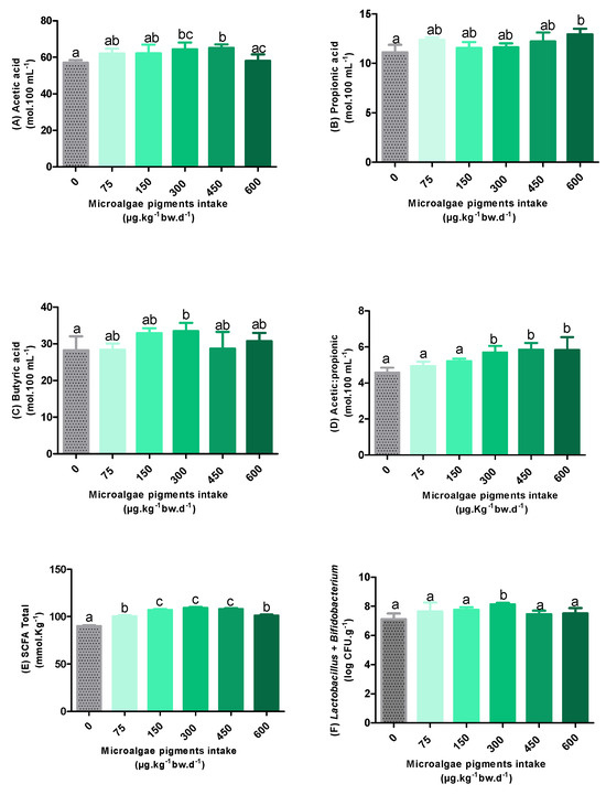 The short-chain fatty acid content (A–E) and total microbiota (F) after the intake of oleoresin with different concentrations of microalgae pigments. Different letters between the columns indicate statistical differences (p < 0.05).