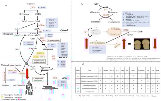 This diagram illustrates the temperature response mechanism of enzymes and genes involved in starch and storage protein synthesis. (a) Biosynthesis pathway of endosperm starch in wheat grains; (b) synthesis process of storage protein; (c) effect of high temperature on enzyme activity during both starch and storage protein synthesis process. The large red arrow in (a,b) represents the common effect of high and low-temperature stress on protein and starch metabolism; The small arrows in (a,b) represent gene upregulation or downregulation, different colors correspond to the different temperature conditions, which are listed in (c), with the arrow pointing up/down indicating positive/negative effects.