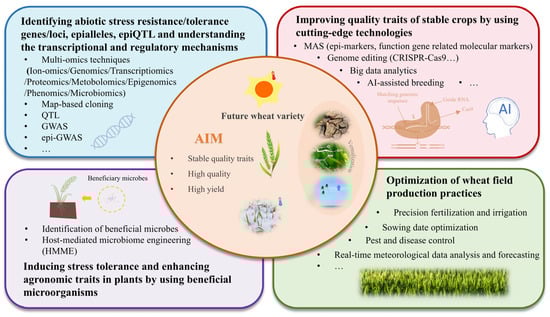 To develop high-quality, high-yield wheat varieties with stable traits, future research should integrate multidisciplinary approaches (Figure 4). (a) First, constructing genotype-protein/starch response maps could elucidate the regulatory mechanisms of protein and starch metabolism across different genotypes under environmental changes (e.g., temperature, drought). This should be coupled with multi-omics analyses, map-based cloning, QTL mapping, GWAS (genome-wide association study), and epi-GWAS approaches to identify the loci/genes, epialleles, epiQTL, and mechanisms associated with abiotic stress tolerance [,]. (b) Second, by using the corresponding molecular markers and epi-markers, molecular marker-assisted selection (MAS) [] could enable early screening of wheat varieties with superior environmental adaptability and quality traits. Advanced gene editing technologies like CRISPR/Cas9 [,] could further allow precise modification of key genes or upstream transcription factors related to heat tolerance, drought resistance, and cold resistance. Moreover, the integration of deep learning, big data analytics, and AI-assisted breeding, screening, and prediction platforms could enhance the efficiency of desired trait screening and predictive breeding []. (c) Third, microbiome engineering approaches could be employed to harness beneficial plant–microbe interactions that enhance wheat’s abiotic stress resilience []. (d) Finally, implementing precision agricultural techniques, including real-time irrigation/climate monitoring, optimized planting schedules [], and targeted fertilization, can counteract environmental stress-induced yield and quality losses in wheat.