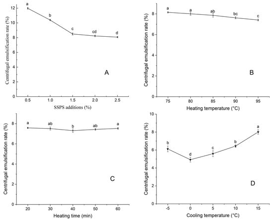 Effect of SSPS concentration (A), heating temperature (B), heating time (C), and cooling temperature (D) on the centrifugal emulsification rate of peanut butter. Different letters indicate significant differences (p < 0.05).