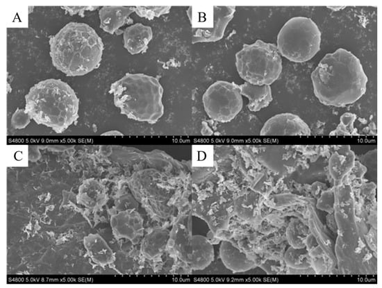 Scanning electron microscopy (SEM) was used to assess the structure of peanut butter with and without SSPS. The BSPB and GPB peanut butter varieties showed no obvious network structure to impede the flow of liquid oil and prevent oil separation (Figure 3A,B). However, the clearly visible network structure in the SSPS-BSPB and SSPS-GPB varieties demonstrated that the SSPS addition to the peanut butter allows a network to form that can impede the flow of liquid oil and prevent its separation (Figure 3C,D). This may be due to the electrostatic interactions between the peanut protein and SSPS in the peanut butter [23]. The formed network structure has a certain oil-binding capacity, hindering the oil flow in the sauce and reducing the centrifugal creaming rate of the peanut butter.