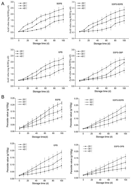 Acid values (A) and peroxide values (B) of peanut butter at different storage temperatures (BSPB: peanut butter prepared from the BS peanut variety; SSPS-BSPB: BSPB with SSPS added; GPB: peanut butter prepared from the G965 variety; SSPS-GPB: G965PB with SSPS added).