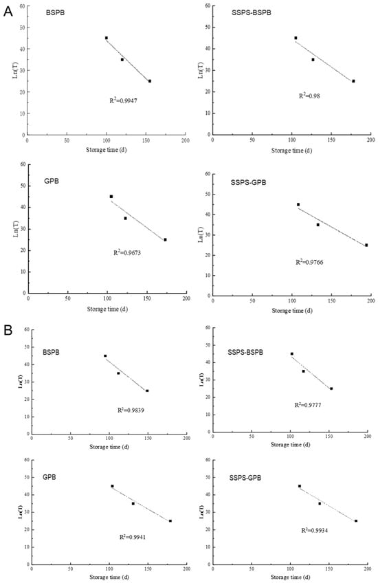 The shelf life equations for the four peanut butter types at various storage temperatures were analyzed and fitted across different temperatures and time points, as shown in Figure 5A,B.