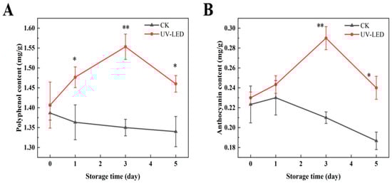 Contents evolution of (A) polyphenols and (B) anthocyanins achieved by UV-LED on different storage days. The contents evolution indicates the difference between the control and treatment groups. Different asterisks within the same group indicate significant differences (** p < 0.01; * p < 0.05). US, ultrasound; UV-LED, ultraviolet-light emitting diodes.