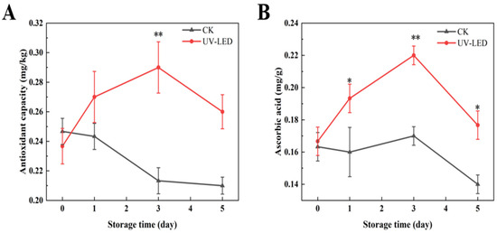 Contents evolution of (A) antioxidant capacity and (B) ascorbic acid achieved by UV-LED on different storage days. The contents evolution indicates the difference between the control and treatment groups. Different asterisks within the same group indicate significant differences (** p < 0.01; * p < 0.05). US, ultrasound; UV-LED, ultraviolet-light emitting diodes.