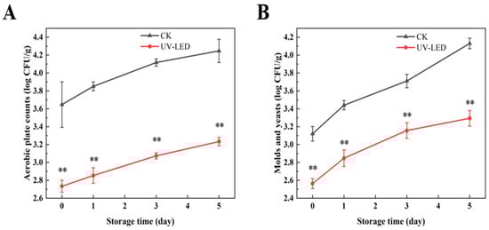 Counts evolution of (A) aerobic plate and (B) molds and yeasts achieved by UV-LED on different storage days. The counts evolution indicates the difference between the control and treatment groups. Different asterisks within the same group indicate significant differences (** p < 0.01). US, ultrasound; UV-LED, ultraviolet-light emitting diodes.