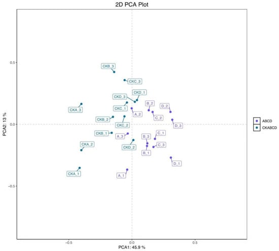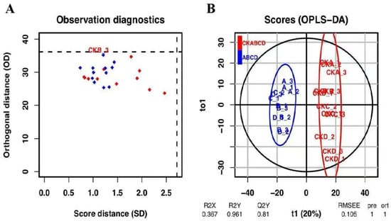 The maximum concentrations of anthocyanin, polyphenol, ascorbic acid, and antioxidant capacity in pomegranate were observed on day 3 of storage following UV-LED treatment. Consequently, selecting a pomegranate on day 3 of storage as the sample for the metabolomic assay was most appropriate. Principal Component Analysis (PCA) is an unsupervised chemometric method employed for exploratory data analysis, which facilitates the identification of the distribution of control and treated samples and elucidates differences between samples. PCA and Orthogonal Partial Least Squares Discriminant Analysis (OPLS-DA) were employed to categorize the pomegranate samples into groups treated with UV-LED (A, B, C, and D) and blank control groups (CKA, CKB, CKC, and CKD). Each group underwent four biological replicates. The results of the PCA are presented in Figure 4, with highly significant differences between groups and high clustering within groups []. This suggests substantial variability between the metabolites of the blank control group and those of the UV-LED-treated group, thereby confirming the validity of the model predictions.