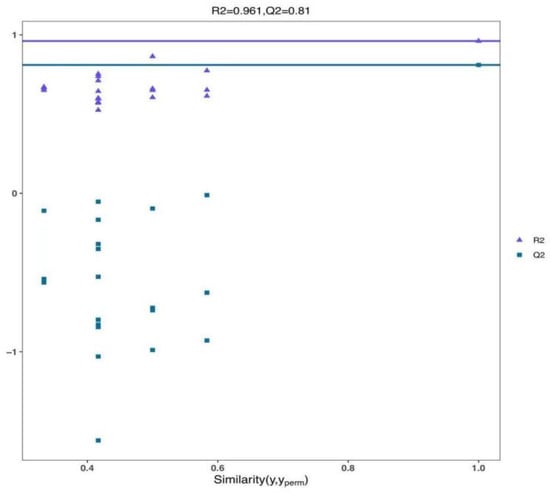 As depicted in Figure 6, the judgment model’s credibility parameters, pR2Y (the degree of model interpretability) and pQ2 (the degree of model predictability), were 0.961 and 0.81, respectively. Both values exceed 0.8, indicating that the model exhibits high credibility and demonstrates a good fit. Therefore, it is deemed suitable for the subsequent identification and screening of differential metabolites.