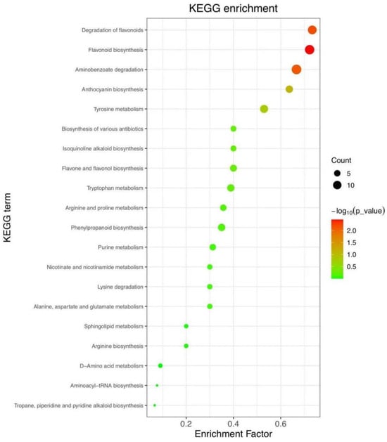 As demonstrated in Table 1, the KEGG-enriched pathway analysis revealed an increase in seven compounds within the anthocyanin metabolic pathway. These compounds were Chrysanthemin, Delphinidin-3,5-O-diglucoside, Cyanidin-3,5-O-diglucoside, Leucodelphinidin 3-glucoside, Peonidin-3-O-rutinoside chloride, Delphinidin-3-caffeoylglucoside, and Peonidine-3-O-glucoside chloride. Chrysanthemin is the primary anthocyanin present in pomegranates, contributing to their distinctive red and purple coloration [].