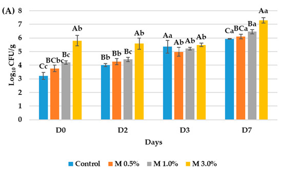 Results from the quantification of the Log10 CFU/g of food in (A) lactic acid bacteria count and (B) total aerobic mesophilic bacteria count of the mortadella samples thought the 7-day incubation. The control consisted of mortadella without the bioactive ingredient, while M 0.5%, M 1.0%, and M 3.0% corresponded to mortadella samples formulated with 0.5%, 1.0%, and 3.0% of the bioactive ingredient derived from the ODN medium fermented by L. plantarum VC7, respectively. Different letters were used to signal significative differences of the studied parameters. Capital letters were used for the comparation among different days and case letters for the comparation among samples the same day.