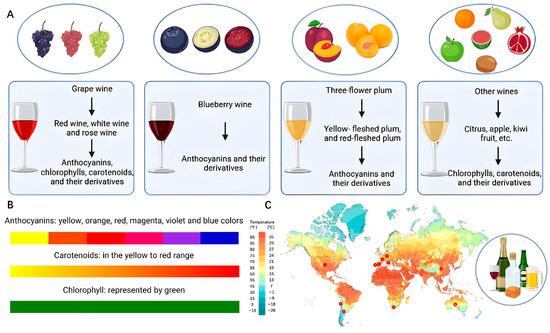 Common fruit wine and their raw materials. (A) The characteristics and main color substances of color pigments from common fruit wine and raw fruit categories. (B) Color characteristics of common pigments in fruit wine. (C) World map and some countries with large fruit wine production.