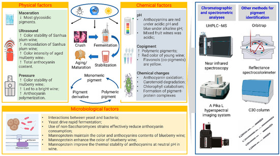 The transformation and identification of pigment molecules during different periods of fruit wine fermentation and their effects on fruit wine quality. The left side shows the factors that affect the pigment change during fermentation, and the right side shows some advanced methods currently used for the accurate identification of pigment molecules.