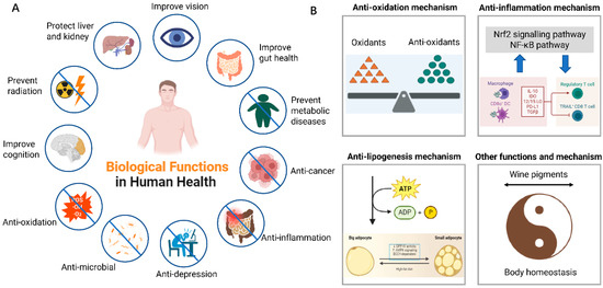 An overview of biological activities and action mechanisms of fruit wine pigments. (A) The effect of fruit wine pigments on human health. (B) Potential mechanism of fruit wine pigments to improve body homeostasis.
