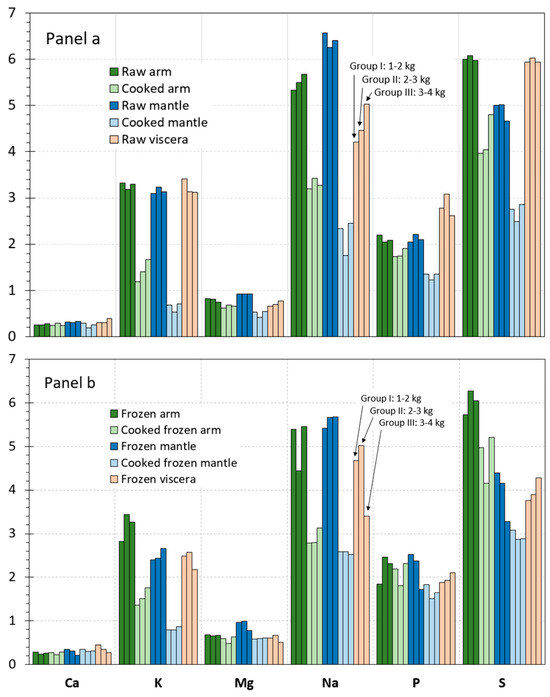 As a result, a remarkable decrease (p < 0.05) of the K, Na, P, and S values was proved in cooked arm and mantle tissues when compared to the counterpart raw tissues. Average values of Mg also provided a decreasing tendency with cooking processing; however, differences were only significant (p < 0.05) in the case of the cooked and cooked frozen mantle tissues. In contrast, no effect (p > 0.05) was proved for Ca values in arm and mantle tissues as a result of the thermal treatment.