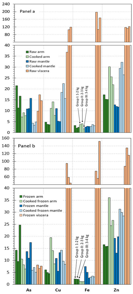 An increasing tendency was observed in cooked arm and mantle for Cu, Zn, Cd, and Pb contents; in contrast, the As value underwent a decrease as a result of the thermal treatment. Remarkably, the content of elements such as Fe, Ba, Co, Mn, and Sn did not show differences in cooked arm and mantle tissues when compared to the counterpart raw tissues.