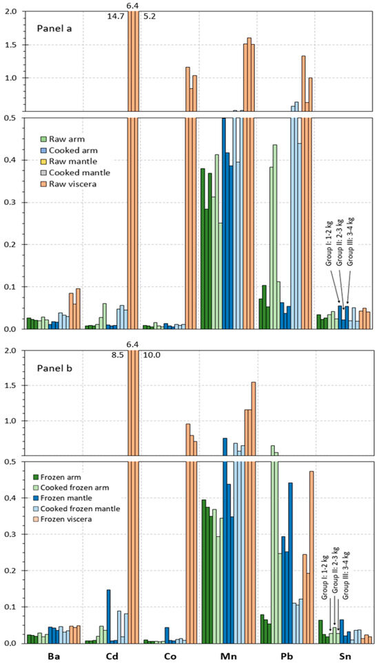 Microelement (Ba, Cd, Co, Mn, Pb, and Sn) contents (mg·kg−1 wet tissue) in raw and processed tissues of octopus. Panel (a): raw and cooked samples and Panel (b): frozen and cooked frozen samples. Three weight sizes of octopus specimens as expressed in Figure 1.