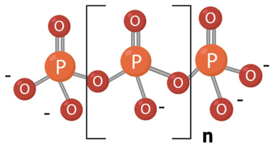 Polyphosphate (polyP) is a linear polymer composed of phosphoryl monomers linked by high-energy phosphoanhydride bonds (Figure 1). PolyP chains range in length from three to several hundred residues. Although considered to exist almost exclusively as a linear polymer within organisms, recent evidence suggests that alternative configurations, such as branched polyP, may be more stable in aqueous media than previously thought [1,2]. PolyP can also be produced abiotically in environments such as volcanoes [3] and it is thought to have been present on prebiotic Earth, contributing to the conditions for the emergence of life. It may have been incorporated into prebiotic vesicles, serving as a source of inorganic phosphate (Pi) and high-energy bonds and potentially acting as a precursor to ATP [4]. This molecule is found in every type of cell, including bacteria, archaea, fungi, protozoa, plants, and animals [4,5,6].
