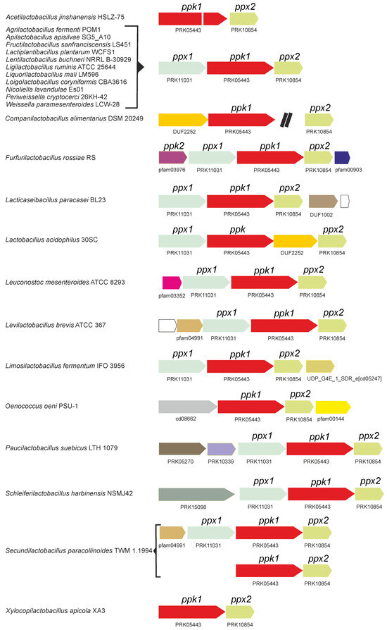 Analysis of the genetic organization of polyP genes in Lactobacillaceae revealed that a gene cluster with the gene order ppx1-ppk1-ppx2 is the most common gene arrangement in Lactobacillaceae species [34] (Figure 2). Additional genes may be present in some genera alongside this core cluster, although there is no evidence of their involvement on polyP metabolism. Notably, ppx1 is absent in some genera such as Acetilactobacillus, Companilactobacillus, Oenococcus, and Xylocopilactobacillus, whereas Secundilactobacillus encodes two copies of ppk1 and ppx2 (Figure 2). In contrast, ppk2 genes are usually monocistronic and located apart from the other polyP metabolic genes, with the exception of Furfurilactobacillus, where all genes are located within the same cluster (Figure 2).