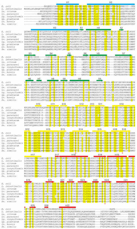 Sequence alignment of polyphosphate kinases (Ppk1) from representative Lactobacillaceae species and Escherichia coli K12 (NP_416996.1). Lactobacillaceae sequences comprise Lactobacillus intestinalis (WP_304402131.1), Leuconostoc citreum (WP_349532772.1), Lc. paracasei BL23 (CAQ67833.1), Loigolactobacillus coryniformis (WP_146990929.1), Lp. plantarum WCFS1 (CCC78296.1), Lv. brevis (WP_141373826.1), and Secundilactobacillus similis (WP_057152190.1). Identical or highly conserved residues are indicated by yellow shading. Secondary structure elements derived from the E. coli Ppk1 structure as described by Zhu et al. [44] are shown above the sequences: α-helices are depicted as bars and β-strands as arrows. The colors of these elements correspond to the four structural domains of E. coli Ppk1. The phosphorylated residue H435 and the residues involved in autophosphorylation (D470 and E623) are marked with red stars.