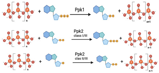 The discovery of Ppk2 originated from the observation that a Pseudomonas aeruginosa mutant defective in Ppk1 still produced up to 20% of the wild-type polyP levels [24,46]. This suggested that another enzyme might be responsible for additional polyphosphate kinase activity [46]. Subsequently, Ppk2 was identified as the enzyme responsible for synthesizing guanosine triphosphate (GTP) from guanosine diphosphate (GDP) and polyP in P. aeruginosa [47]. As noted above, Ppk2 proteins share no significant sequence similarity with Ppk1, and structural analyses have shown that they adopt different folds [24]. Biochemical analyses have revealed that P. aeruginosa Ppk2 exhibits a 75-fold preference for polyP degradation over synthesis [24,47]. Consequently, Ppk2 enzymes are more efficient in ATP/GTP synthesis due to their preference for nucleoside phosphorylation in the reversible reaction. Therefore, while Ppk1 acts preferentially in ATP-dependent polyP synthesis, Ppk2 is more efficient in synthesizing ATP/GTP from polyP (Figure 4).