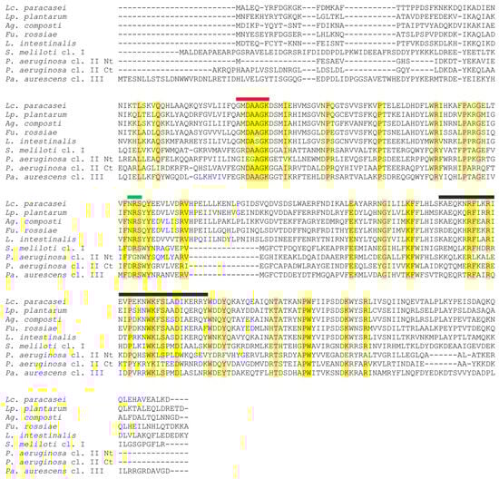 Sequence alignment of selected Lactobacillaceae species and representative sequences of the three subfamilies of polyphosphate kinase 2 proteins (Ppk2). Identical or highly conserved residues are indicated by yellow shading. The Walker A motif is designated by a red bar, the Walker B motif is indicated by a green bar, and the lid module is indicated by a black bar, as identified by Nocek, et al. [50]. Lactobacillaceae sequences comprise Lc. paracasei BL23 (CAQ66314.1), Lp. plantarum WCFS1 (WP_003642687.1), Agrilactobacillus composti DSM 18527 (KRM35117.1), Furfurilactobacillus rossiae DSM 15814 (KRL53865.1), and L. intestinalis DSM 6629 (KRM32733.1). Sinorhizobium meliloti 1021 (WP_010968631.1) represents class I Ppk2, Pseudomonas aeruginosa PAO1 (NP_252145.1) represents class II, and Paenarthrobacter aurescens TC1 (WP_261609683.1) represents class III. The two domains of P. aeruginosa class II Ppk2 are aligned separately and indicated as Nt and Ct, respectively.