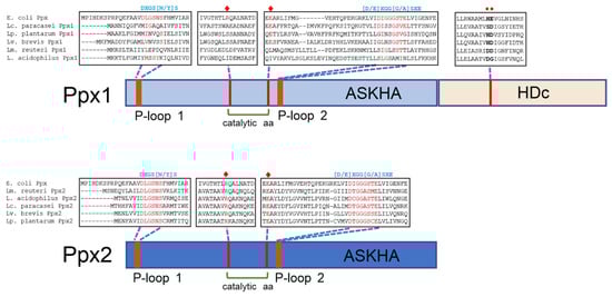 Schematic representation of Ppx1 and Ppx2. The presence of different protein domains (ASKHA and HDc) is depicted, together with relevant portions of multiple sequence alignments of Ppx1 from Lc. paracasei (WP_003606084.1), Lv. brevis (AYM03703.1), Lp. plantarum (WP_103851489.1), Limosilactobacillus reuteri (MCH5356744.1), and Lactobacillus acidophilus (MCT3601606.1) and from Ppx2 from Lc. paracasei (CAQ67832.1), Lv. brevis (WP_135367400.1), Lp. plantarum (WP_003641094.1), Lm. reuteri (KRK50994.1), and L. acidophilus (AZN76677.1), compared with Ppx from E. coli (WP_001121363.1). The consensus sequences of the conserved P-loop 1 and P-loop 2 in the GppA/Ppx family are shown in blue above the alignments. The catalytic amino acids arginine and glutamic acid are marked with red diamonds. The amino acids characteristic of the HDc domain in C-terminal Ppx1 are marked with red circles. Reproduced with permission from Corrales et al. [35].