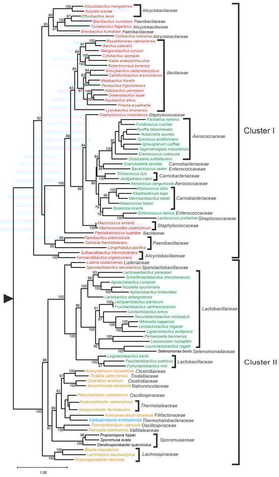 LAB were first defined by Orla-Jensen as a group of Gram-positive, non-sporulating, non-motile bacteria with coccoid or rod forms and the ability to catabolize sugars, mainly to lactic acid [20]. This classification encompassed a heterogeneous group, including bifidobacteria and lactobacilli, among others. Advances in molecular phylogenetic analyses have since clarified the taxonomic status of the bacterial groups formerly included in LAB. Today, the term LAB specifically refers to organisms belonging to the phylum Bacillota, class Bacilli, and order Lactobacillales. Phylogenetic studies indicate that Lactobacillales constitutes a monophyletic group [21,22], comprising the families Aerocococcaceae, Carnobacteriaceae, Enterocococcaceae, Lactobacillaceae, and Streptococcaceae. Many LAB species are considered Generally Recognized as Safe (GRAS) by the US FDA or QPS (Qualified Presumption of Safety), according to European legislation [23], due to their long-standing use in the production of fermented foods and their natural presence as commensals in the human gastrointestinal tract. Furthermore, some of them are considered as health-promoting bacteria.