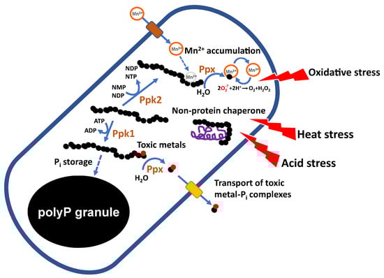 PolyP may also inhibit the Fenton reaction, which generates highly reactive hydroxyl radicals, by chelating cations such as Fe2+ or Cu2+ and stabilizing the Fe3+ intermediates [63,66]. In, Lp. plantarum, polyP-complexed Mn2+ also appears to contribute directly to O2− scavenging [74]. Notably, Pi limitation reduces Mn accumulation in Lp. plantarum ATCC 14917 [75], and, conversely, Mn-depleted conditions inhibit polyP synthesis in both Lp. plantarum [75] and Lacticaseibacillus rhamnosus ATCC 7469 [76]. These findings suggest a regulatory mechanism coordinating intracellular Mn and Pi accumulation.
