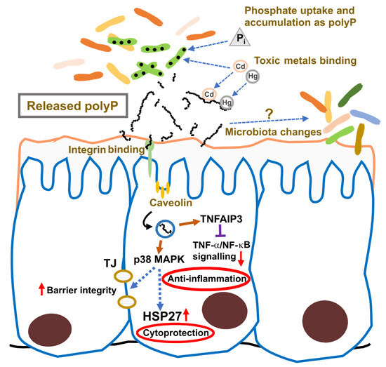 Early research showed that Lv. brevis SBC8803 induces cytoprotective heat-shock proteins in the small intestine and protects against intestinal injury in a mouse model of acute colitis [88]. The responsible factor, identified in the bacterial culture supernatant, was polyP [19]. This probiotic-derived polyP replicated the beneficial effects of the SBC8803 strain in Caco-2/BBE cells, inducing HSP27 and protecting cells against oxidative damage caused by H2O2 or NH2Cl. In a murine colitis model, polyP suppressed the induction of the proinflammatory cytokines IL-1β and IL-6 and improved survival [19]. Mechanistic analyses indicated that polyP protects intestinal barrier function via the integrin-p38 MAPK signaling pathway with no apparent action on other MAPK pathways such as ERK, JNK, or Akt. Analyses using integrin β1 antagonists showed that the protective effect of polyP was abolished, and coimmunoprecipitation assays with 32P-labeled polyP demonstrated that polyP binds to integrin β1. These results demonstrated that polyP interacts with integrin β1, leading to the activation of p38 MAPK [19]. Unlike other host–microbe interaction factors, polyP signaling is not mediated by pattern recognition receptor (PRR) pathways. Instead, it is internalized through the integrin–caveolin-mediated endocytic pathway and induces TNFAIP3 (tumor necrosis factor alpha-induced protein 3) expression in Caco-2/BBE cells. This provides a mechanistic basis for its anti-inflammatory properties through inhibition of TNF-α/NF-κB signaling and enhancement of intestinal barrier function [89].