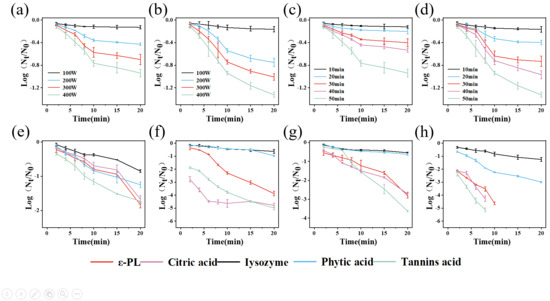 Microbial reduction by PAW produced at different preparation powers ((a), S. aureus; (b), E. coli), by PAW produced for different preparation times ((c), S. aureus; (d), E. coli), by different natural antimicrobial agents alone ((e), S. aureus; (f), E. coli), and by combination treatments of different natural antimicrobial agents with PAW ((g), S. aureus; (h), E. coli).