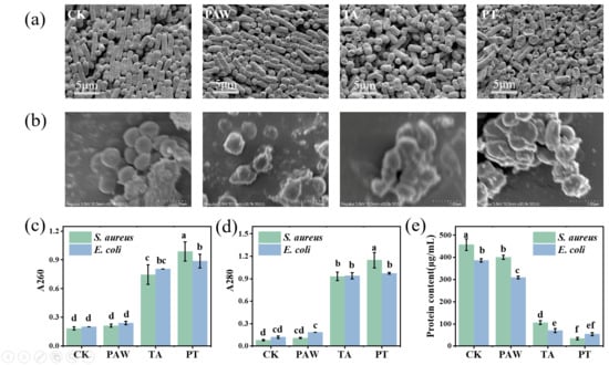 SEM images of E. coli (a) and S. aureus (b); changes in nucleic acid (c) and protein (d) leakage in S. aureus and E. coli; intracellular protein content in S. aureus and E. coli cells (e). Results with different lower-case letters are significantly different (p < 0.05). CK, TA, PAW, and PT represent the control, tannic acid, plasma-activated water, and combined tannic acid–plasma-activated water treatments, respectively.