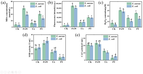 Effects of different treatment durations on MDA content (a), ROS content (b), H2O2 content (c), SOD enzyme activity (d), and CAT enzyme activity (e) in S. aureus and E. coli cells. Results with different lower-case letters are significantly different (p < 0.05). CK, TA, PAW, and PT represent the control, tannic acid, plasma-activated water, and combined tannic acid–plasma-activated water treatments, respectively.