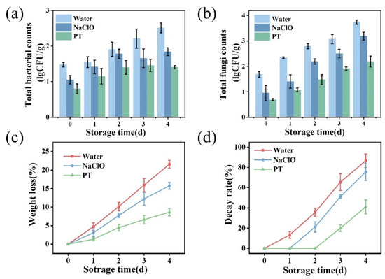 As shown in Figure 4c, weight loss increased over time, with the slowest loss rate observed in the combined treatment group, followed by the sodium hypochlorite and water-washed groups. The results suggest the combined treatment not only reduced surface microbes but also prevented weight loss. Figure 4d shows mold incidence increased during storage, remaining lowest in the combined treatment (41% on day 4), representing 53% and 46% reductions compared to the water-washed and sodium hypochlorite groups, respectively. This demonstrates significant inhibition of spoilage microorganisms by the combined treatment.