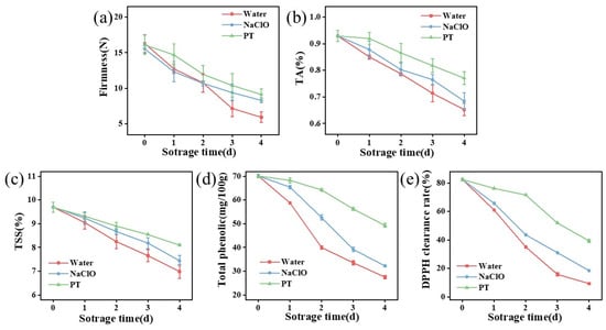 Effects of different treatments on firmness (a), titratable acidity content (b), total soluble solid content (c), total phenolic content (d), and DPPH scavenging rate (e) of strawberry samples. TA indicates titratable acidity, while TSS means total soluble solids. PT indicates the combined treatment of 1% tannic acid and plasma-activated water.