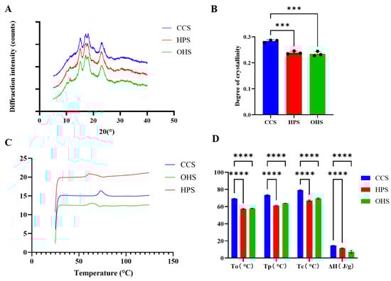 (A) XRD pattern of CCS, HPS, OHS; (B) Significance analysis plot of the crystallinity of three starches; (C) DSC pattern of CCS, HPS, OHS; (D) Significance analysis plot of T0, Tp, TC, ΔH. Significance levels are:, *** p < 0.001, **** p < 0.0001.