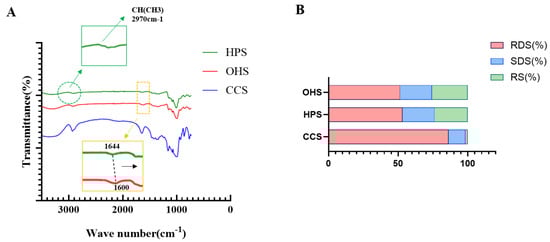(A) FT−IR spectra of CCS, OHS, HPS; (B) RDS, SDS, and RS contents of CCS, OHS, HPS.