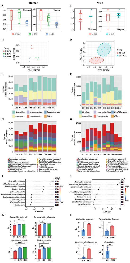 Figure 3G demonstrates the variation in the abundance of microbial communities at the species level. LDA (Figure 3I) showed that the HPS group, OHS group, and CCS group differed significantly on 10 species. Further significance analysis (Figure 3K) revealed that the relative abundance of Bacteroides uniformis in the HPS and OHS groups was significantly higher (p < 0.01) compared with that of the CCS group. It has been reported that Bacteroides uniformis was able to degrade β-glucan and promote Lactobacillus johnsonii to alleviate colitis by increasing indole-3-lactic acid levels []. This bacterium has also been shown to have endurance-enhancing properties []. In addition, the abundance of Parabacteroides distasonis was significantly increased (p < 0.01), and the study suggests that Parabacteroides distasonis has an anti-inflammatory effect in the intestinal microbiome and is capable of exerting intestinal epithelial monolayer-enhancing effects to strengthen the intestinal barrier []. Furthermore, HPS and OHS led to a significant increase in the abundance of Agathobacter rectalis, and recent studies have shown that the proliferation of this bacterium ameliorates the pathological damage caused by Alzheimer’s disease (AD) and exerts an inhibitory effect on microglia activation [].