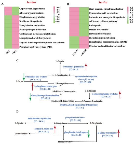 Changes in KEGG pathways in vitro and in vivo (A,B); Effects of OHS on phenylalanine metabolism pathway (C,D); Red line: upregulate; Green line: downregulate.