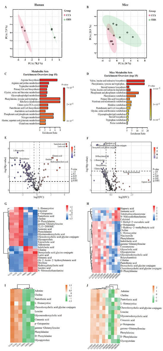 (A) Effect of OHS on metabolite β diversity in vivo; (B) Effect of OHS on metabolite β diversity in mice; (C) Diversity enrichment analysis in vivo; (D) Diversity enrichment analysis in mice; (E) Volcano plot of metabolite in vivo; (F) Volcano map of metabolite in mice; (G) Heatmap of differential metabolites in vivo; (H) Heatmap of differential metabolites in vivo; (I) Co-altered metabolites in vitro; (J) Co-altered metabolites in vivo.