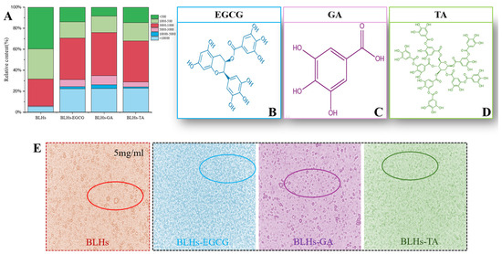 Figure 2A shows the relative percentage of molecular weight of each component before and after the complexation of BLHs with EGCG, GA and TA. In the lower-molecular-weight fractions of 1000–500 and less than 500, the low molecular weights of the three complexes bound to the polyphenols were reduced, but still accounted for a large proportion, because the proteins were degraded to peptides after enzymatic degradation, and the low-molecular-weight substances of the peptides were still present even when bound to the polyphenols [25]. Among the higher-molecular-weight fractions greater than 10 kDa, BLHs accounted for 5.4%, while BLHs-EGCG, BLHs-GA and BLHs-TA maintained a share of about 22%, a 4.07-fold increase relative to BLHs. In addition, the same trend was observed in the 5–10 kDa, 3–5 kDa and 1–3 kDa fractions, which occurs because protein or peptide radicals preferentially attack polyphenols in the presence of large numbers of polyphenols. Covalent bonding directly attaches phenolic molecules to polypeptide chains, resulting in an increase in the molecular weight of the complexes, which is consistent with the findings of He et al. [26]. It is therefore reasonable to conclude that in the binding of polyphenols to proteins/peptides, the complexes tend to take the form of macromolecules.