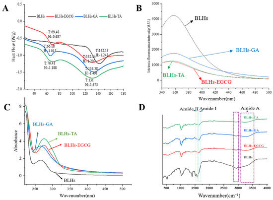 DSC is commonly recognized as an effective thermal analytical method for examining the interactions between proteins and phenolic compounds. The peak sizes are typically used as indicators of the thermal stability of the samples [34]. As shown in Figure 3A, the plots of BLHs modified by polyphenols are basically similar, all of which produce two peaks at 60–80 °C versus 140–160 °C, respectively, corresponding to the two peak melting temperatures (Tp), and the different peak temperatures indicate that the number of conjugates is both increasing and decreasing to different degrees [34]. The thermal absorption peaks of BLHs-EGCG, BLHs-GA and BLHs-TA were significantly lower compared with the denaturation temperatures of BLHs, suggesting that covalent binding induced by different structural polyphenolic compounds reduced the thermal stability of bovine liver hydrolysate. The thermal stability of proteins is related to the structural changes in the α-helix and the mobility of the branched chain during the modification process [37]. The addition of polyphenols may disrupt the original secondary structure of the bovine liver hydrolysate, making it more likely to unfold when heated and accelerating the denaturation process. Furthermore, based on the molecular weight results demonstrating that polyphenols and bovine liver hydrolysates form macromolecules as a result of binding, it is possible that these aggregates may exhibit a decrease in apparent thermal stability, assuming that phase separation occurs as a result of the increased hydrophobicity of these aggregates when subjected to heat.