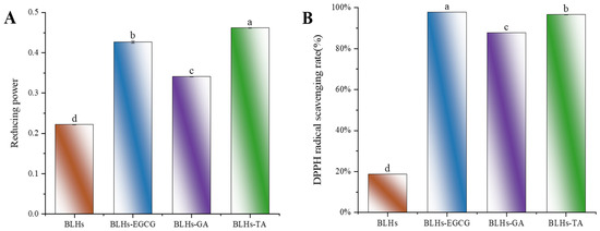 To measure the changes in antioxidant activity of EGCG-, GA- and TA-modified BLHs, we used three in vitro antioxidant evaluation methods, namely reducing power, ABTS and DPPH, which are widely used for the determination of antioxidant activity, and shown in Figure 4A–C. The reducing power value of BLHs was 0.222. After modification, there was a significant difference (p < 0.05) between the reducing powers of BLHs-EGCG, BLHs-GA and BLHs-TA, which increased approximately 1.5-2.1-fold when compared to the BLH control group. In the ABTS scavenging activity assay, the free radical scavenging capacity was consistent with the reduced capacity, and the antioxidant capacity was BLHs-TA > BLHs-EGCG > BLHs-GA in descending order, all of which were significantly greater than that of BLHs (p < 0.05). This difference in activity may be related to the increase in the number of hydroxyl (OH) groups grafted onto BLHs and when polyphenols bind to proteins, The free hydroxyl group on the benzene ring can act as an antioxidant, and the polyphenol–protein system can scavenge free radicals, form more stable reaction products and terminate the free radical chain reaction [38]. In addition, we found that BLHs modified with EGCG\TA recorded DPPH scavenging rates of (97.8% and 96.5%) at 1 mg/mL, respectively, possessing higher DPPH scavenging viability compared to GA-modified BLHS, and these results suggest that grafting of bovine liver hydrolysates with different kinds of polyphenol radicals can have the effect of enhancing antioxidant capacity.