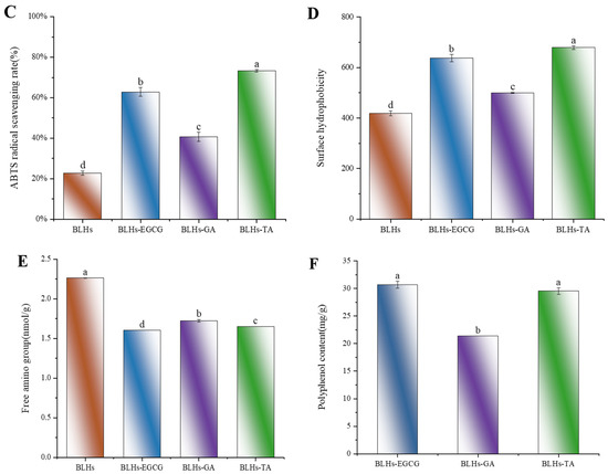 (A). Schematic representation of the reducing ability of BLHs, BLHs-EGCG, BLHs-GA and BLHs-TA. (B). DPPH radical scavenging of BLHs, BLHs-EGCG, BLHs-GA and BLHs-TA. (C). ABTS radical scavenging of BLHs, BLHs-EGCG, BLHs-GA and BLHs-TA. (D). Schematic representation of the changes in surface hydrophobicity of BLHs, BLHs-EGCG, BLHs-GA and BLHs-TA. (E). Schematic diagram of changes in free amino acid content. (F). Differences in polyphenol content of the three complexes (Note: Lowercase letters represent significant differences among samples).